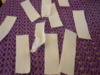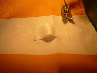 Z mocnej tasiemki ucięłam 18 kawałków do zrobienia osiemnastu pętelek. Trzeba pamiętać o zabezpieczeniu końcówek , aby się nie strzępiły. Pętelki przyszyłam wzdłuż obu 3metoewj długości boków, w takiej odległości, jak rozstaw rurek. Trzeci rząd pętelek wykonałam przez środek, w miejscu gdzie będzie rurka środkowa. Po sześc pętelek w rzędzie. Rurki będą pełnić rolę prowadnic.