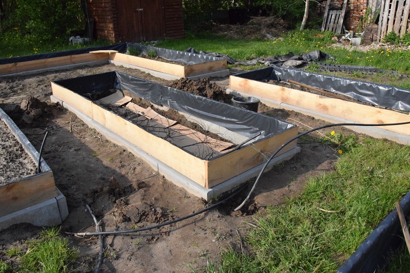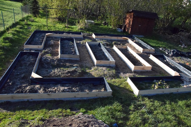 Żeby zabezpieczyć drewno przed wilgocią od środka wyłożyliśmy skrzynie czarną folią. Lepiej byłoby ułożyć folię kubełkową, ale zdecydowaliśmy się na tańszą opcję