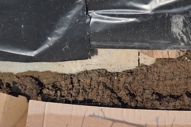 A teraz etapy wypełniania skrzyni. Najpierw zdjęliśmy wierzchnią warstwę żyznej ziemi, pogłębiając skrzynię o sztych. Ziemia ta zostanie później wykorzystana do wypełnienia. Żeby skrzynie nie stały się stołówką dla kretów i myszy na dno położyliśmy siatkę drobnooczkową. Na siatkę zgodnie z zasadami permakultury położone zostały szare kartony.
