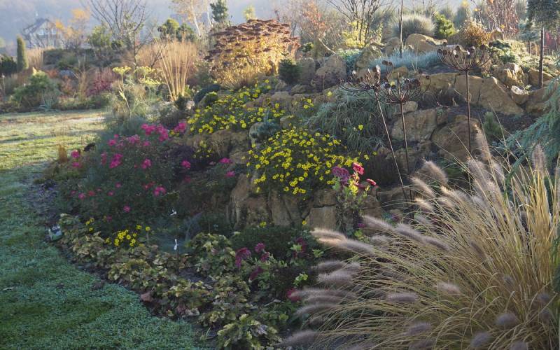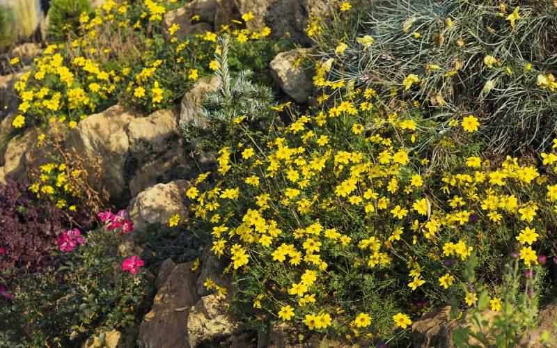 "Yellow Charm" – pokrój zwarty, silnie rozkrzewiony, kwiaty ciemnożółte, duże z żółtym koszyczkiem.