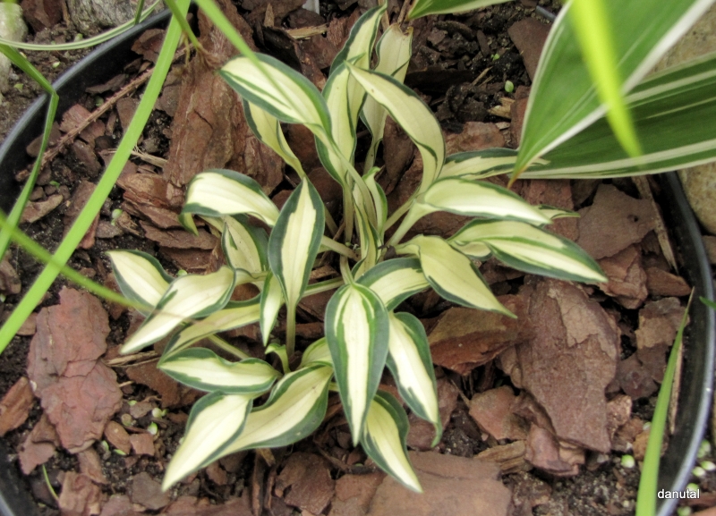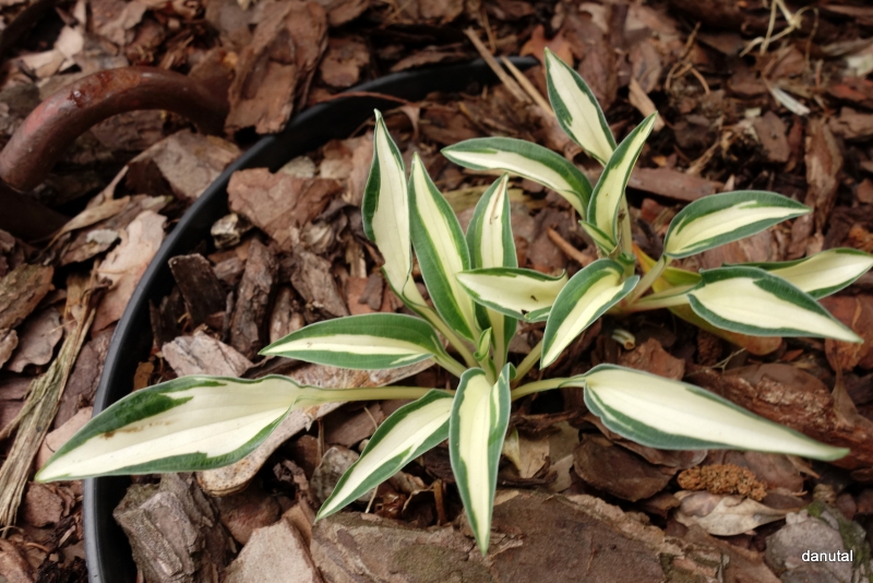 Rozmiar: D/S wysokość 10-15cm Liście: kremowobiałe centrum z wąskim zielonym marginesem Kwiaty: jasno-lawendowy w lipcu/sierpniu Zalecane stanowisko: półcień do cienia Uwagi: