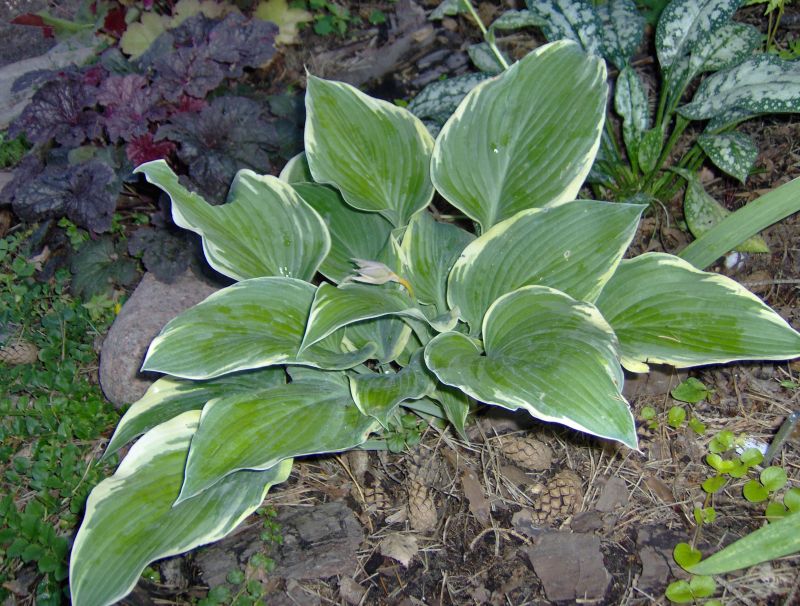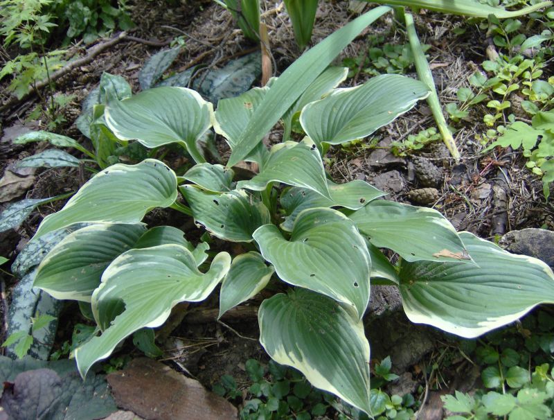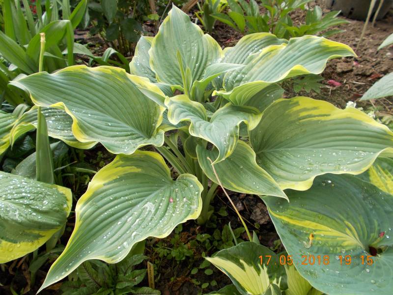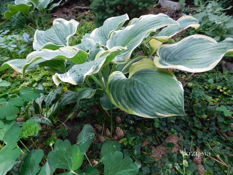 Liście: sztywne, duże (ponad 30 cm długości), sercowate; wiosną niebieskozielone z jasnozielonym , dośc wąskim, ale rozlewającym się w głąb liścia marginesem; w sezonie centrum staje się błyszczace, zielone a brzeg wyżółca się ; dobra substancja z lekkimi burchlami