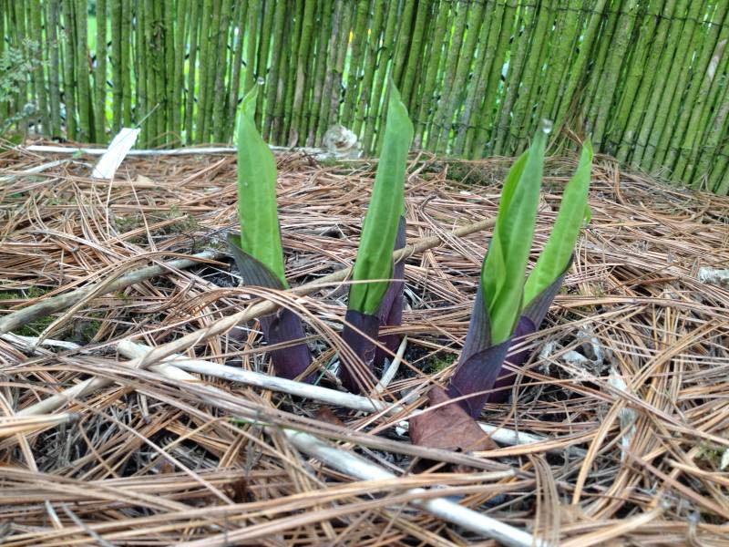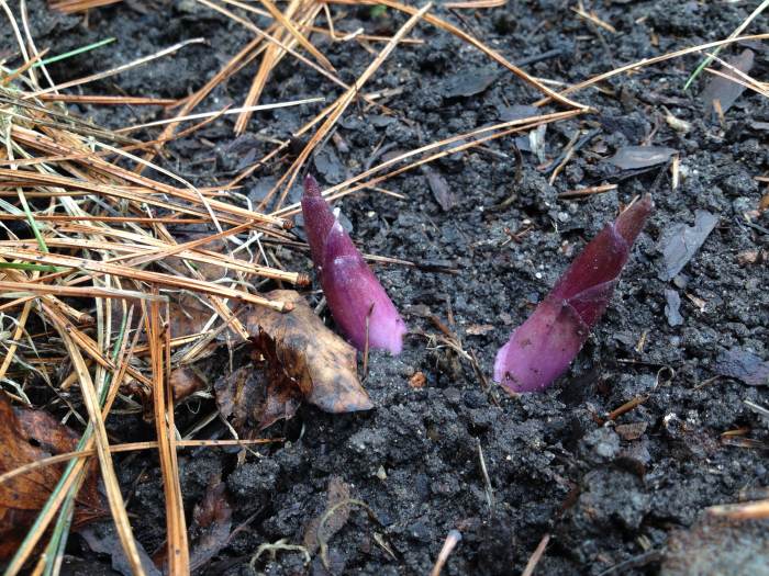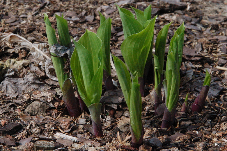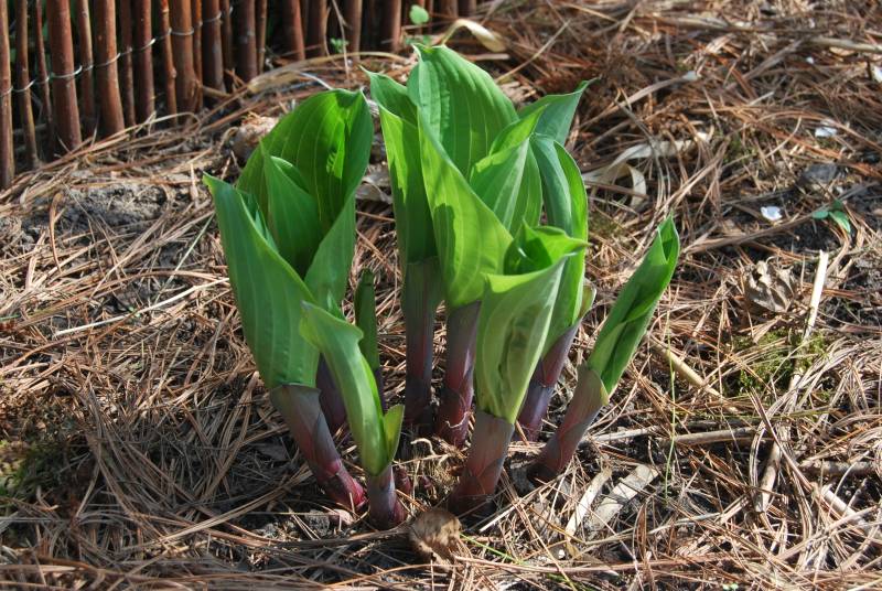 . Sadzoneczka przyszła marniutka, ale po 2 latach nabrała nieco ciałka. Dziś ma około 15 kłów. Na zdjęciu Halszki widać, jakie są fioletowe, gdy wychodzą z ziemi. Później ten kolor zostaje w nasadzie łodyg i pięknie współgra z kolorem liści.