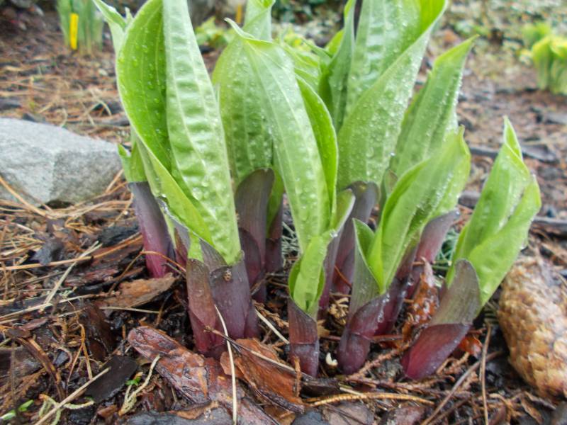 Kły hosty 'Phantom' mają jeden z najładniejszych kolorów. Zestawienie bordowej nasady i wychodzących z kła świeżych liści jest przepiękne.