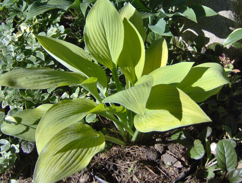 Liście: żółto złote, złote, wybarwiają się nierównomiernie, ze smugami, sztywne, lekko pokarbowane, spód pokryty sinym nalotem