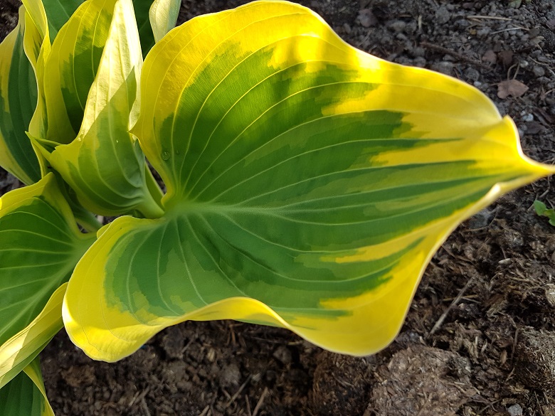 Liście: duże , sercowate , spiczasto zakończone . Środek liścia wiosną niebiesko-zielony w trakcie sezonu zmienia się w ciemną zieleń.Margines wiosną jaskrawo żółty stopniowo przechodzi w trakcie sezonu w kremowy.