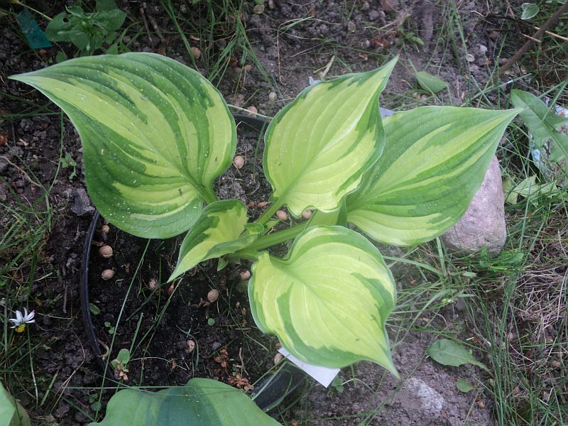ventricosa Aureomaculata. Wiosną jest bardzo jaskrawa- mocno żółte centrum otoczone jest żywozielonym marginesem. Powierzchnia liścia lśni, odbijając promienie słoneczne, co jeszcze potęguje wrażenie jaskrawości. Wraz z upływem sezonu liście ciemnieją, stają się coraz bardziej zielone. Bardzo ciekawa hosta, ale chyba głownie dla ogrodów kolekcjonerskich