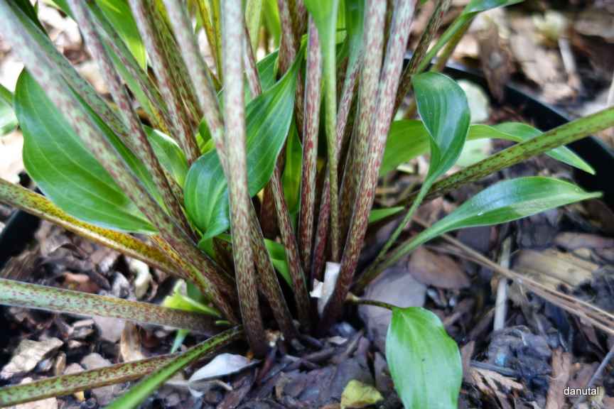 Rozmiar: M wysokość 35-40cm. Liście: ciemnozielone, mocno błyszczące, spiczaste, o pofalowanym brzegu i skręconym czubku Kwiaty: ciemno-lawendowe, prawie purpurowe na czerwono nakrapianych łodygach Zalecane stanowisko: od słońca do cienia Uwagi: