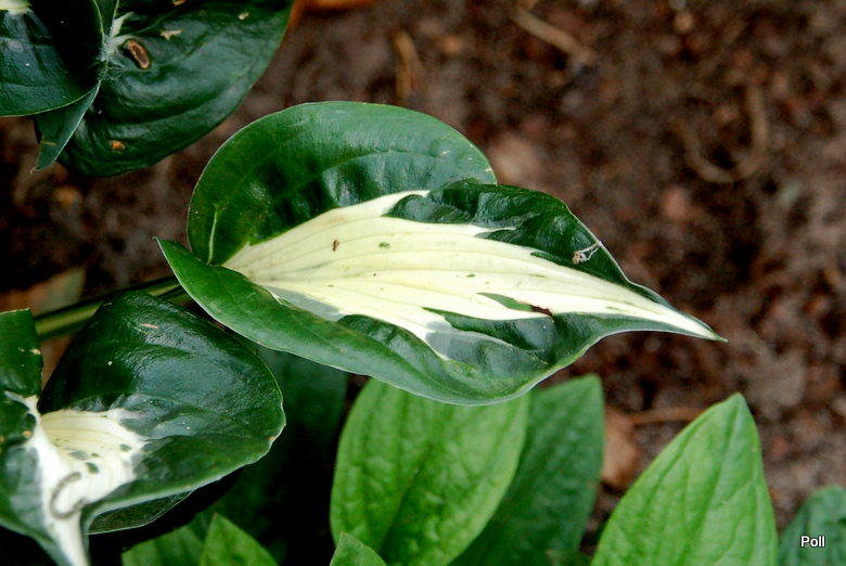 Liście: sercowate, mocno powykręcane, bardzo twarde i sterczące do góry, sprawiają wrażenie plastikowych; białe, nakrapiane na zielono centrum, z ciemnozielonym, szerokim marginesem