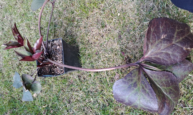 Pąki kwiatowe i nowo zawiązujące się liście też ciemnobordowe.