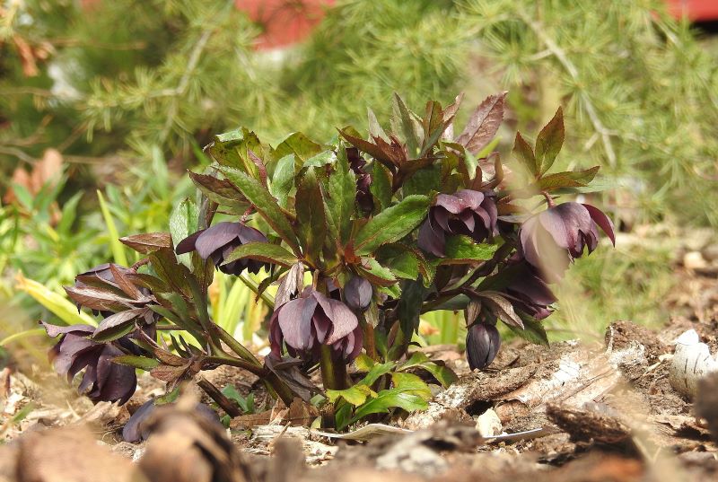 Helleborus x hybridus 'Manon' kwiatów w tym sezonie ma sporo, ale trochę ukryte są wśród liśćmi.