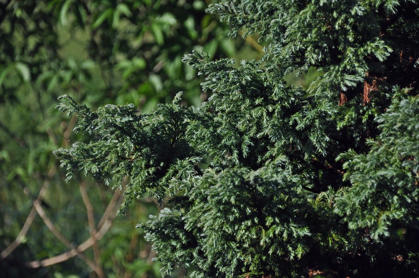 Pień prosty, gładki, w dolnych partiach szeroko karbowany. Kora czerwonobrązowa, z wiekiem łuszcząca się długimi pasami. Dolne części gałązek silnie wybarwione na niebieskobiały kolor.