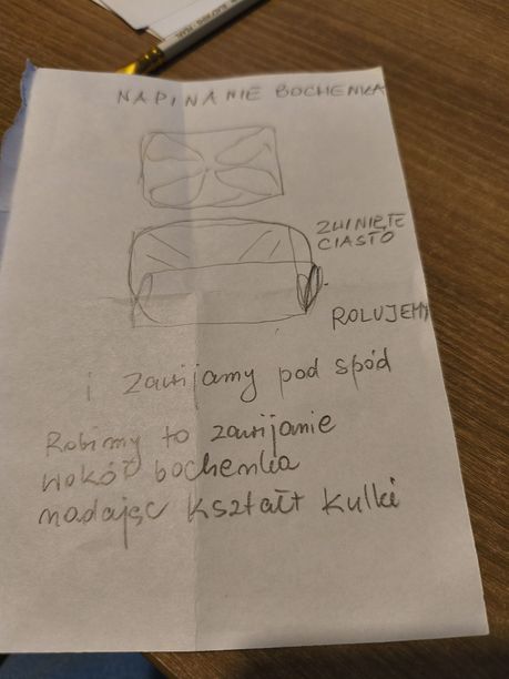 Napinanie ciasta to zrolowanie tej koperty, a następnie podłożenie jej końców pod spód i uformowanie kuli. Trzymając kulę w dłoniach kilkakrotnie lekko napinasz ciasto pod spód, jakbyś chciała rozciągnąć ciasto i nadmiar zebrać od spodu...