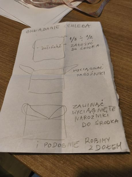 składa, czyli ciasto wyjmujesz z miski, w miarę delikatnie, żeby nie poszarpać struktury ciasta za mocno , ja "odcinam" łopatką od brzegów miski i zsuwam ciasto na podsypaną mąką blat.