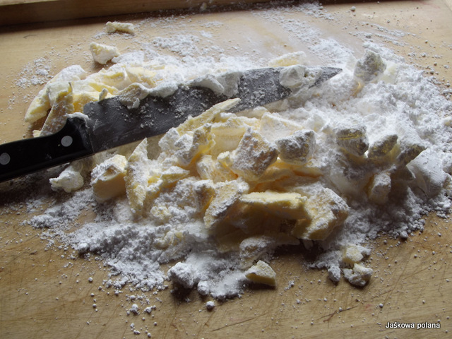Mąkę i proszek do pieczenia przesiać do miski, dodać masło, posiekać nożem. Dodać cukier, przyprawy, jajko i pokruszony marcepan. Posiekać nożem a potem wyrobić ciasto ręką. Zawinąć w folię i odstawić na 2 godz. do lodówki.