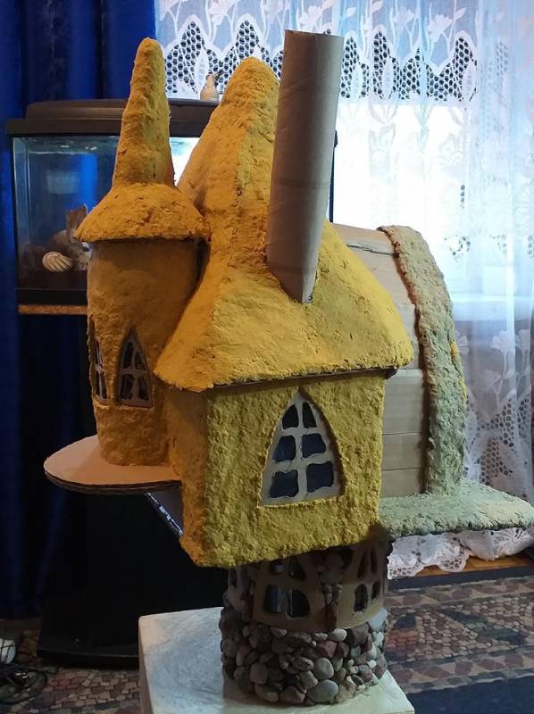 Ramy okien póki co zrobione są z grubej tektury na którą nakładać będę dopiero papkę celulozową, którą widać już na drzwiach zameczku