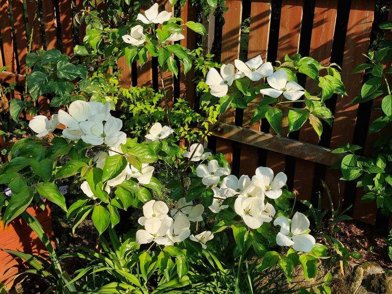 Mój dereń kousa 'Vulcan' ma kilka jesiennych kwiatów, ale nie jest to masowe kwitnienie. Są rzadko rozsypane po gałęziach.
