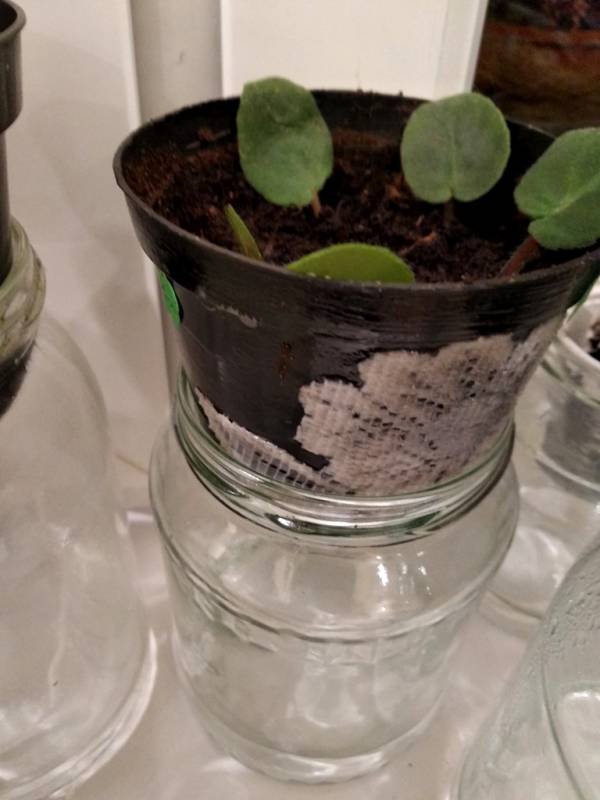 A słoik, no, to też był eksperyment. Listki dostałam w gratisie, dodatek do zakupów, szkoda mi było zmarnować, a maleńkie były, to posadziłam do słoików i zamknęłam. Całą zimę w nich były, otwierałam czasem, bardzo rzadko, żeby przewietrzyć i spryskać całość.