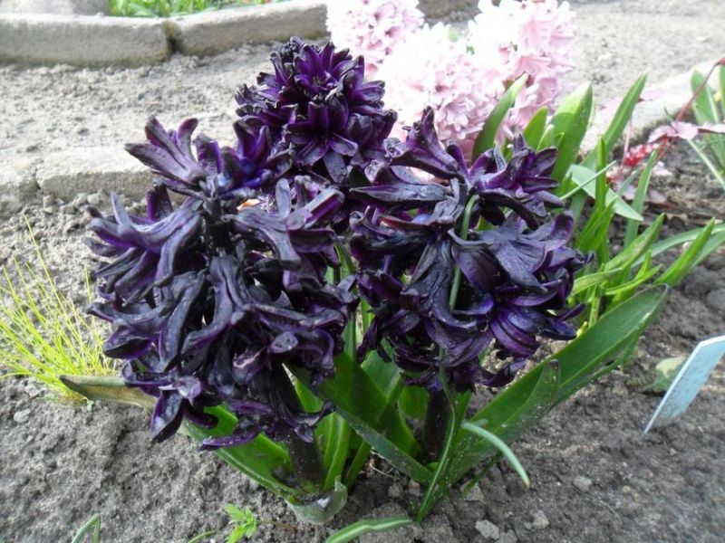 Kiedy kupowałem Hiacynty, długo zastanawiałem się czy wziąć też odmianę 'Dark Dimension' jako, że był to najdroższy z dostępnych w sprzedaży Hiacyntów. Ostatecznie kupiłem jedną cebulę i właśnie ona rozwinęła kwiatostan najszybciej spośród wszystkich posadzonych. Warto było kupić tę odmianę, kontrastuje swoim ciemnym kolorem ze wszystkim, co rośnie wokół