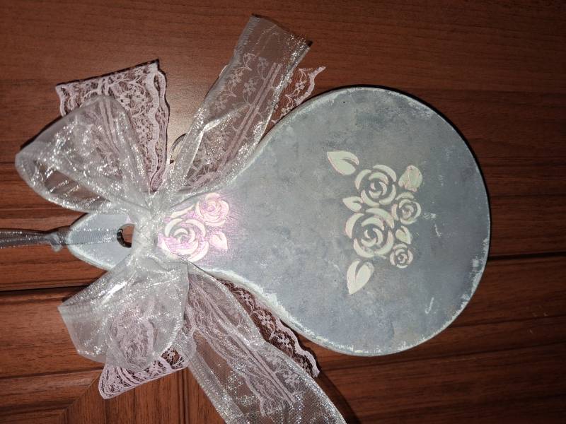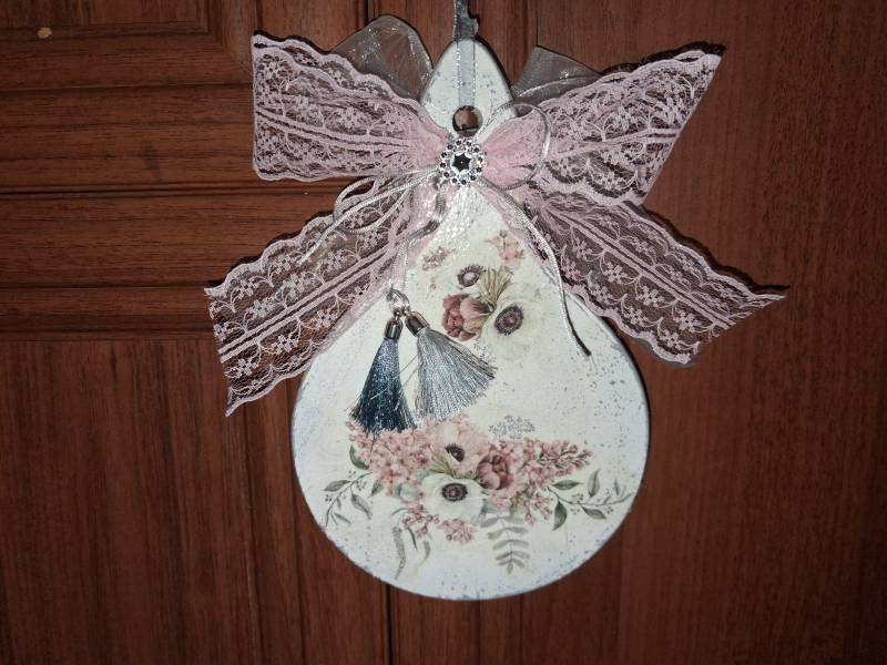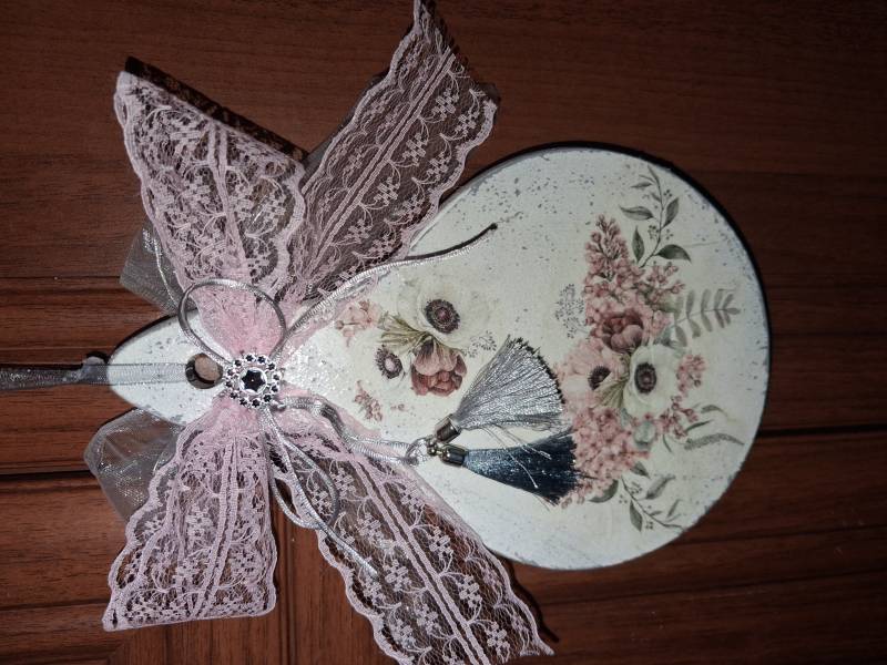 Cierpię na brak czasu, a może to raczej brak organizacji i lenistwo krecigl . Zimowe prace nie dokończone, niektóre od lata czekają na dokończenie. Tak jak ta deseczka - leżała od wiosny czekając na odpowiednią kokardę z koronki