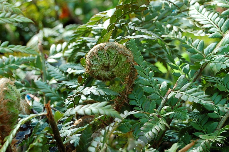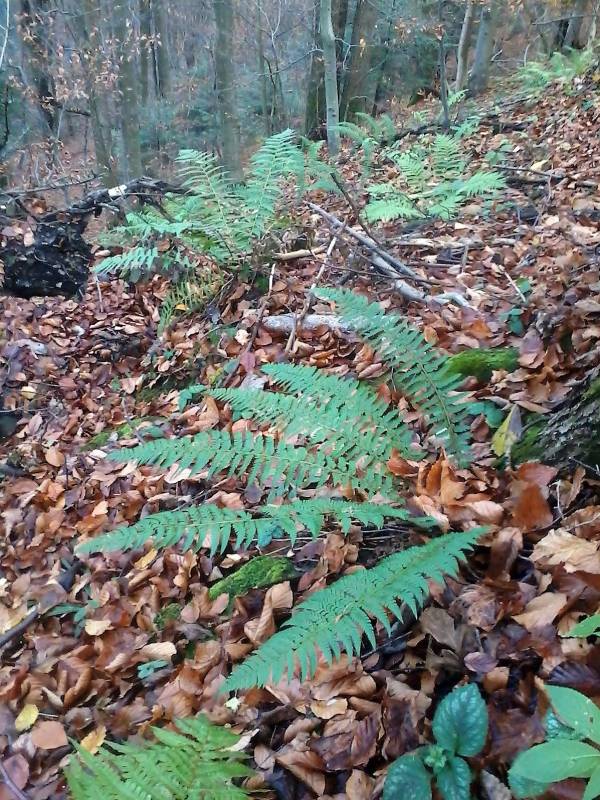 inny egzemplarz na paprociowym stoku - dobrze widać nieco sierpowate frondy