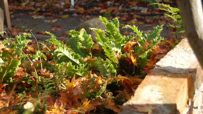 Asplenium scolopendrium 'Crispa' spędzi zimę pod liśćmi klonika palmowego, które obficie go zasypały.