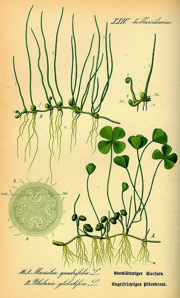 Pilularia globulifera( gałuszka kulecznica). Rycina dokładnie pokazuje jej budowę, (małe,