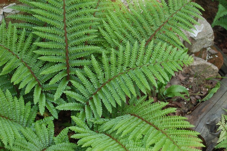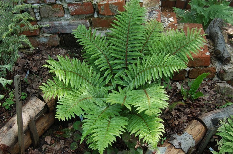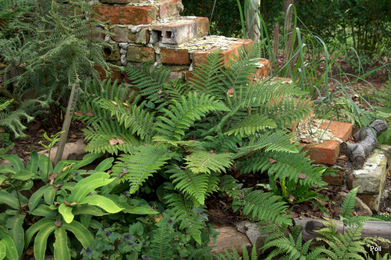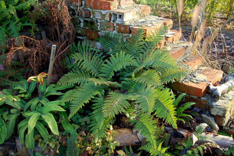 Inny, nieco młodszy egzemplarz Polystichum polyblepharum 'Jade' za murem oporowym stoku paprociowego