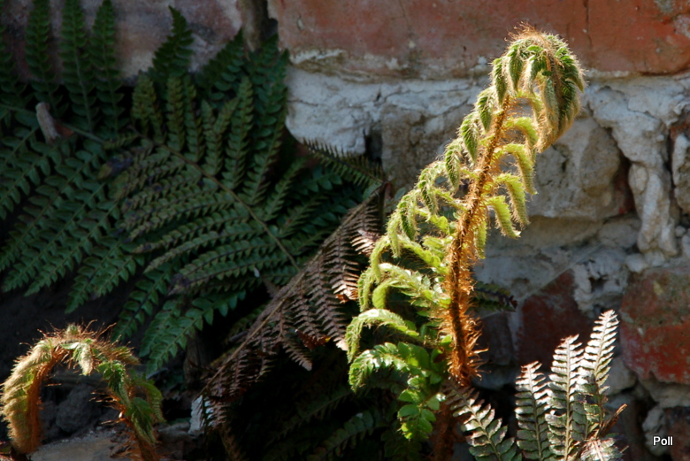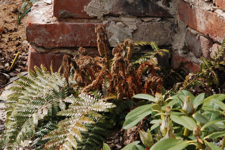 Jeden z moich Polystichum polyblepharum :"Jade' rośnie na bardzo ciepłym stanowisku pod ceglanym murem zapierającym stok paprociowy..To mocno nasłonecznione wiosną miejsce i paprotnik ostro ruszył, choć te na zimniejszych stanowiskach ledwo pokazały pastorały przy ziemi. Po przymrozkach, z niemal rozwinietych liści zostały dyndajace flaczki. :blink: