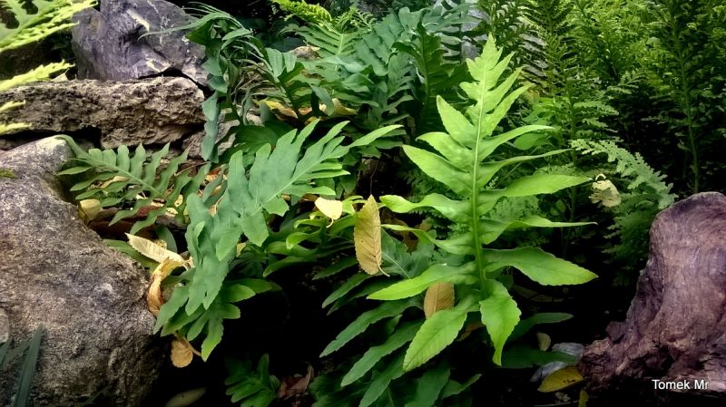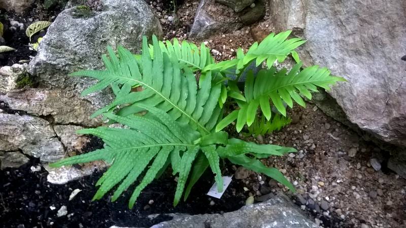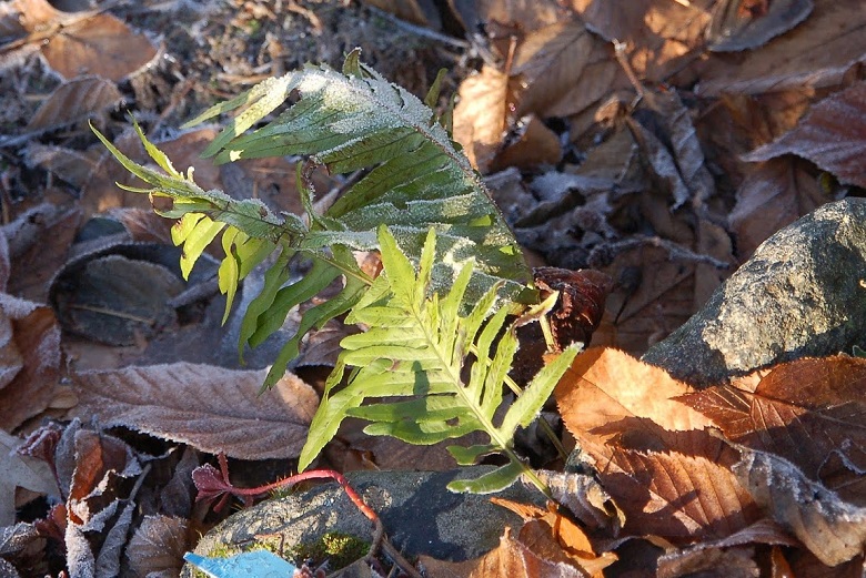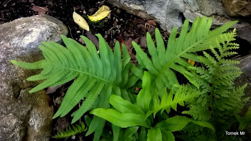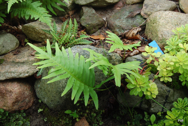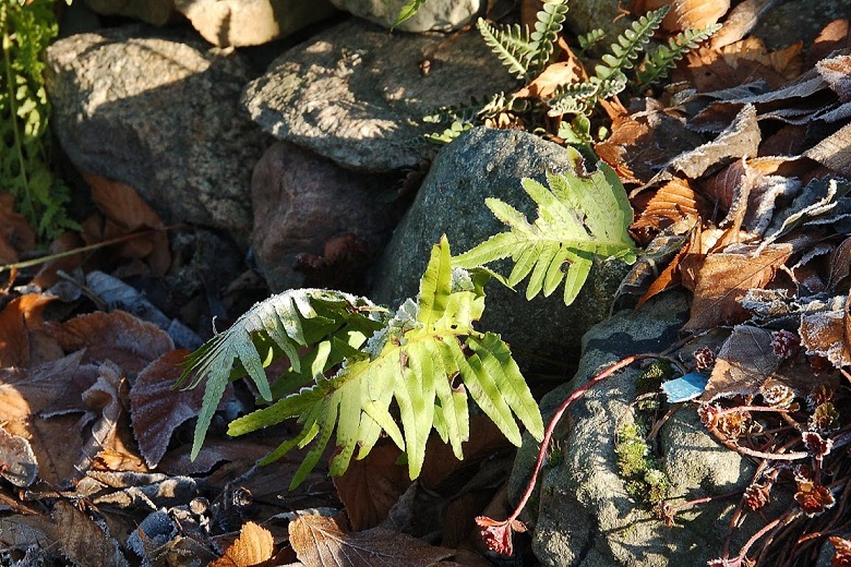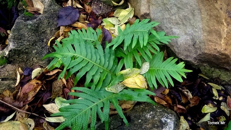 Polypodium cambricum 'Oxford Gold' dwa lata temu weszło kłączem pod kamienie i w tej chwili wybija tylko z tego miejsca. Górna, głowna część prawdopodobnie obmarzła