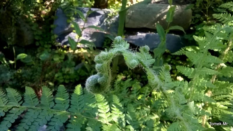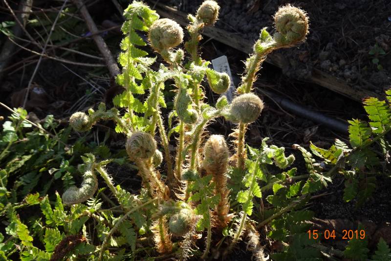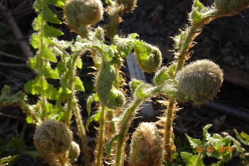 Polystichum microchlamys nie stracił w wyniku przemrożenia tylu pastorałów, co Polystichum retrosopaleaceum ( na fotce, po prawej) i spokojnie się rozwija