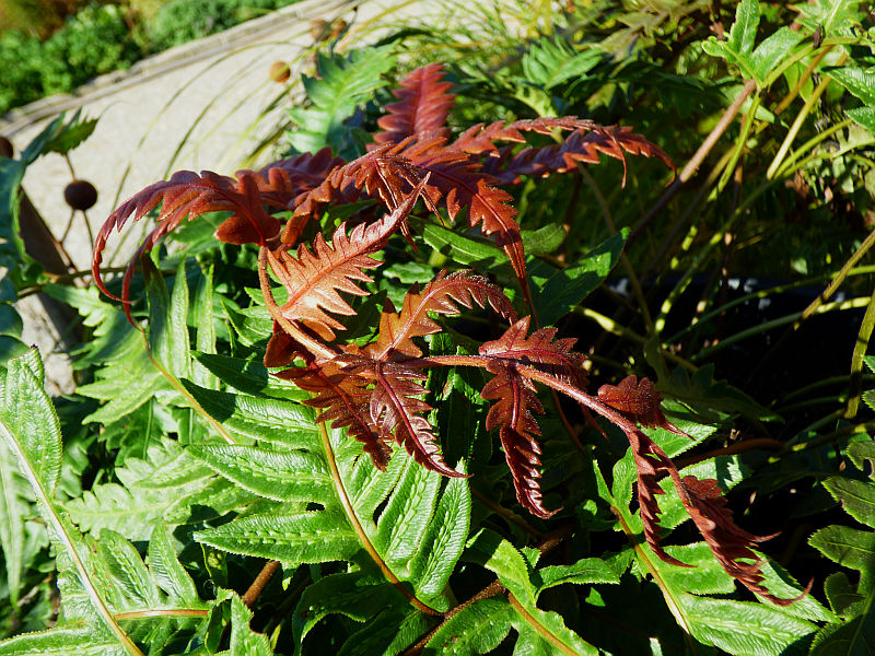 Woodwardia unigemmata ma jednak to do siebie, że produkuje młode liście niemal cały sezon, więc oryginalnym kolorem paproci możemy cieszyć się aż do jesieni.