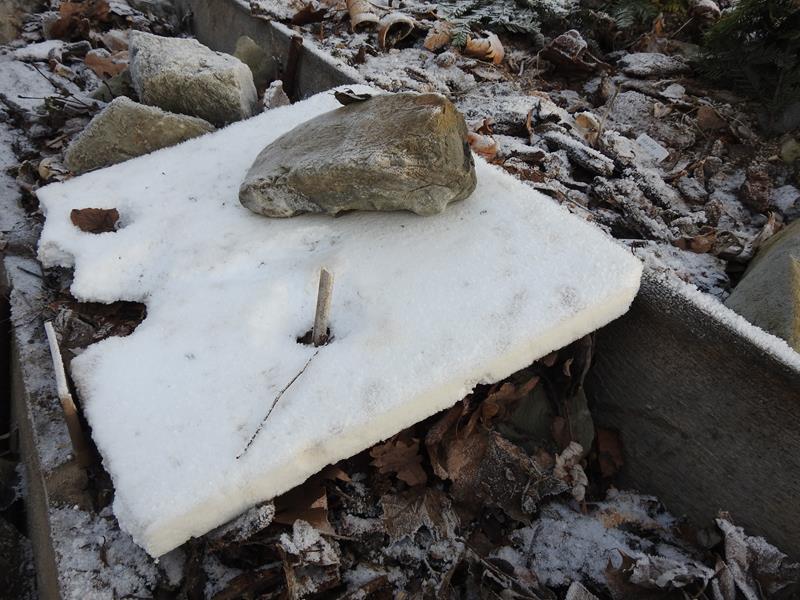 (Mr Goffey nalezy do Plumoso-multilobum Group, która produkuje rozmnóżki liściowe, więc podejrzewam, że właśnie tą drogą pozyskane zostały nasze rośliny). Postanowiłam ją przezimować nie w doniczce, w domu a w gruncie. Dostał miejscówkę na osłoniętym miejscu, za murem stoku paprociowego. Na zimę został solidnie zabezpieczony kilkoma większymi i mniejszymi gałęziami iglastymi.