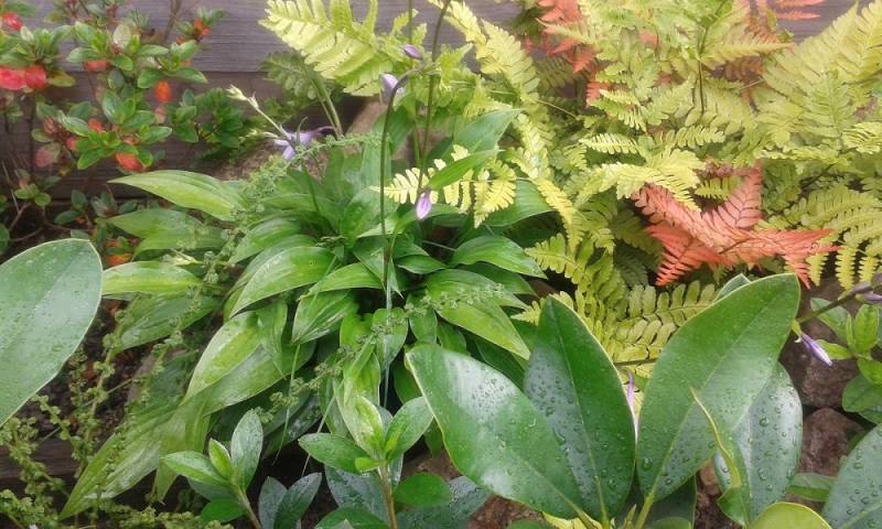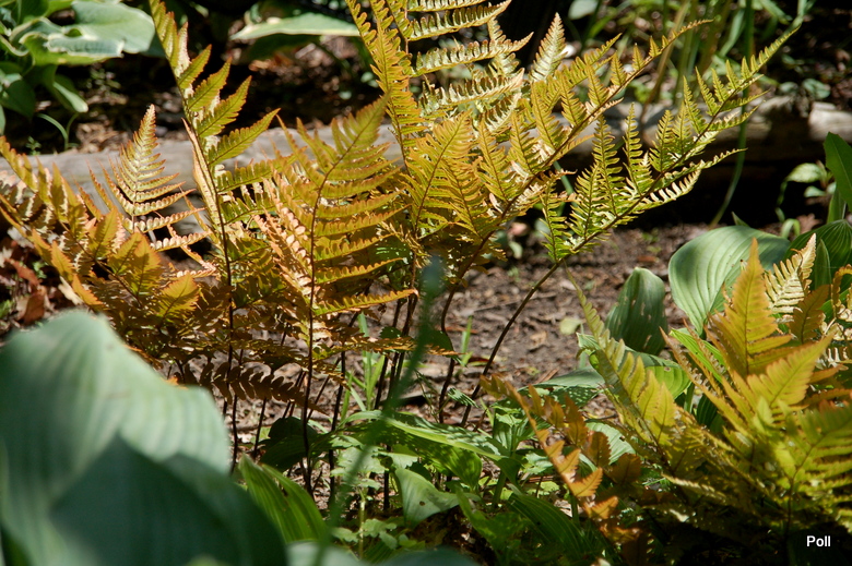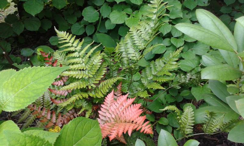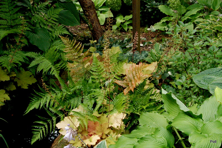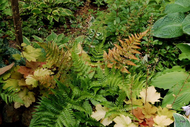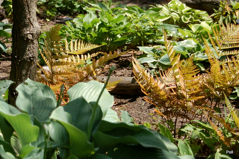 Dryopteris erythrosora z hostami , konwaliami i miodunkami, na dość słonecznym miejscu starego hostowiska
