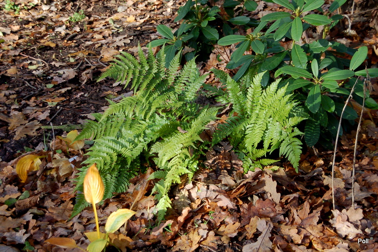 Dryopteris erythrosora na stoku paprociowym ( po prawej