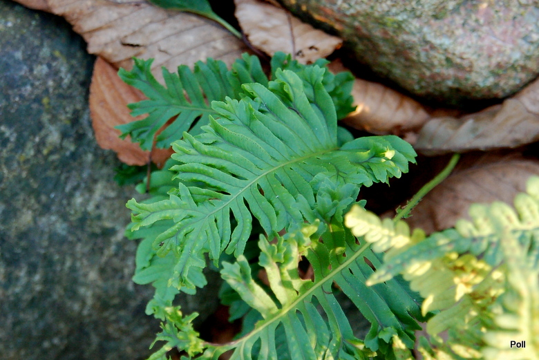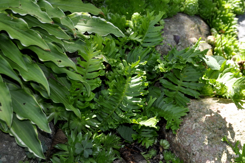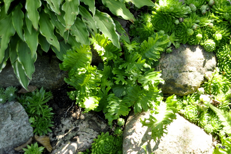 Paprotka walijska Cristatum dobrze w tym sezonie radzi sobie na suchym murku, bo...ma nieco cienia.Inne na które padają popołudniowe promienie słoneczne, mimo wilgoci pod nogami, mają zaschnięte końcówki liści i (dosłownie) wypalone brązowe dziury. Jest to pierwszy sezon, w którym dane jest mi zobaczyć paprotki w takim stanie. Własnie rozpoczęłam przenoszenie ich na inne, mniej 'parzące' miejsca.
