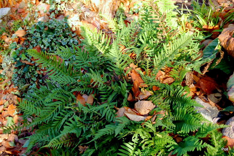 Polypodium interiectum prezentuje się pięknie nawet jesienią, zasypana opadłymi liśćmi . Jest dość wysoka, więc jej frondy sa zawsze dobrze widoczne z daleka