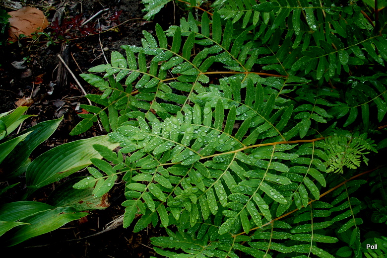 Osmunda regalis var. spectabilis , jest bliźniaczo podobny do naszego długosz królewskiego. Chociaż w tym momencie widać sporą róznicę, bo regalis jest u mnie jeszcze zieloma, a spectabilis już cała w jesiennych barwach. nie wiem czy to kwestia cechy podgatunku czy stanowiska, [iOsmunda regalis var. spectabilis] [/i] ma więcej słońca
