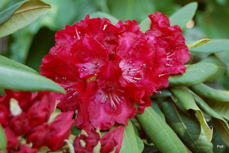 Selekcjoner: Lord Aberconway, Wielka Brytania (wprowadzenie do handlu: 1937) Pokrój: krzaczasty, wyprostowany Siła wzrostu: umiarkowana... po 10 latach dorasta do około 1,50 m wysokości i około 1 m szerokości Liście: ciemnozielone, matowe... o długości do 12,5 cm przy szerokości do 6,5 cm Kwiaty: szkarłatno czerwone, połyskujące, wewnątrz jaśniejsze z zielonkawym rysunkiem... brzegi płatków lekko pofalowane... średnica pojedynczego kwiatu do 9 cm... szeroko lejkowate... zebrane po 15-16 sztuk w wierzchołkowe kwiatostany Termin kwitnienia: połowa maja Mrozoodporność: do -18 °C (ZSP)