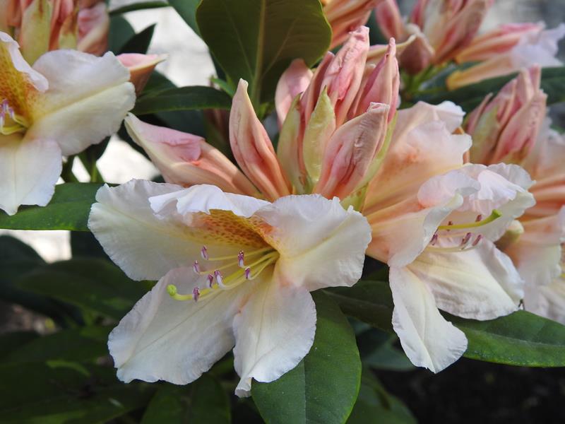 Kwiaty: w pakach delikatnie różowe, rozwinięte: kremowo białe z różowo żółtym cieniowaniem na górnym płatku, lejkowate, 6-7,5 cm średnicy, zebrane po 9-12 sztuk na wierzchołkach pędów w szerokie, kuliste kwiatostany