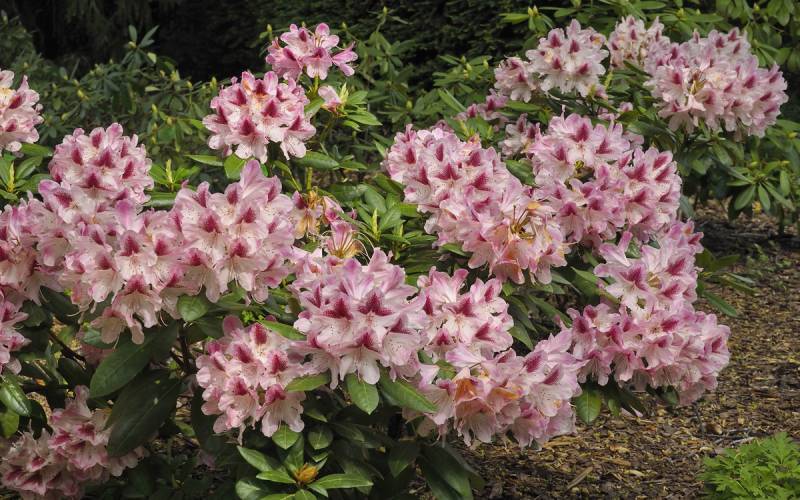 Różanecznik 'Cosmopolitan' w końcowej fazie kwitnienia.