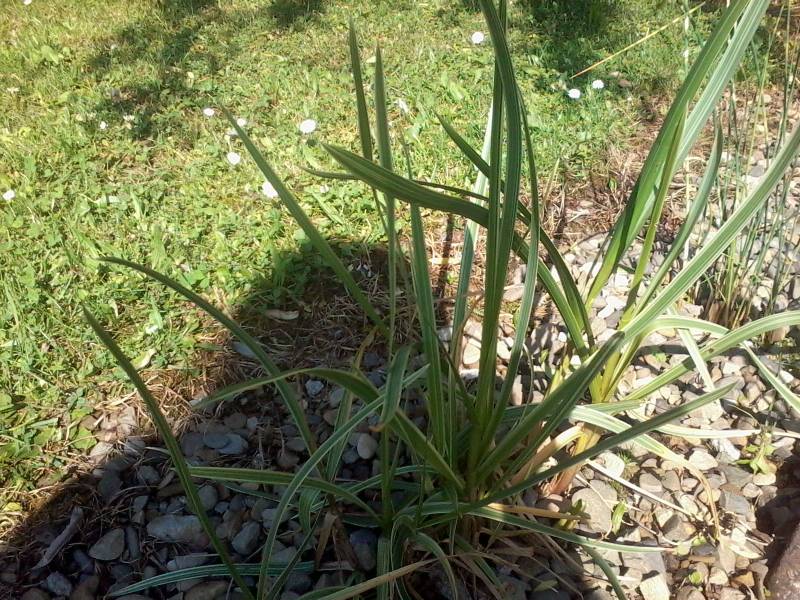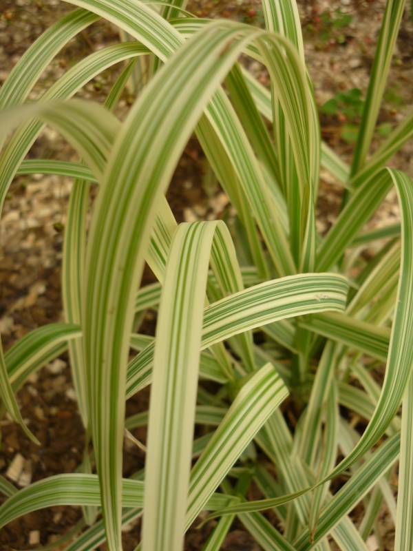 Liście są szorstkie, szerokości do 1cm, kremowo paskowane wzdłuż blaszki liściowej.