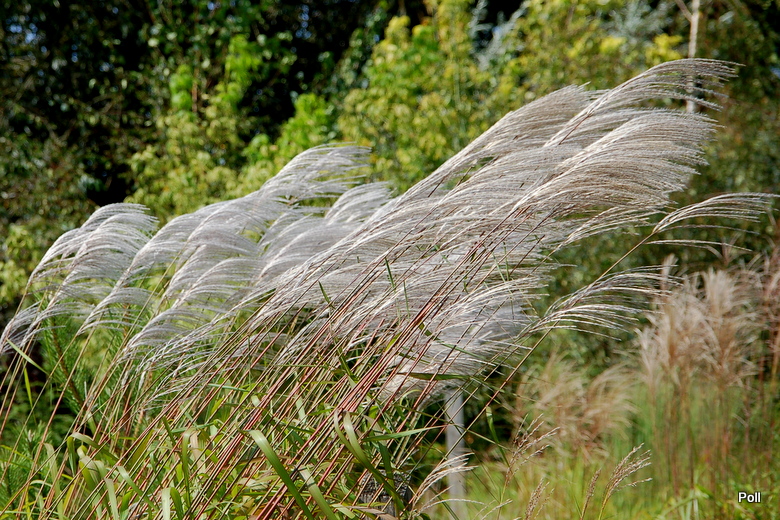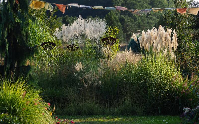 W grupie traw ozdobnych, na środku, góruje nad innymi (po lewej, z białymi kwiatostanami, miskant Memory, Rosi i miskant JP3)
