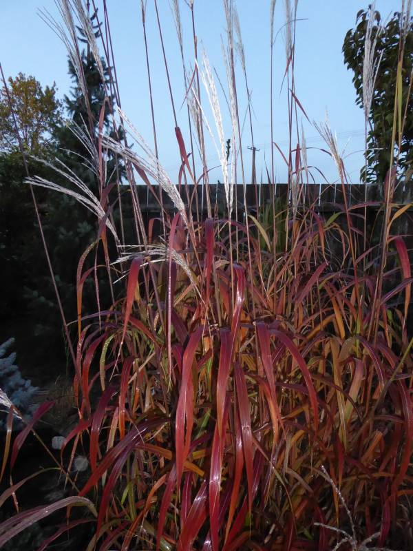 Miskant Rosi w jesiennej, wieczornej odsłonie. Za nim miskant Memory a po prawej (zółty) Ghana.