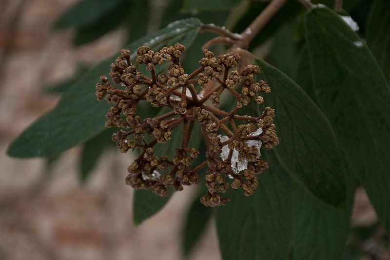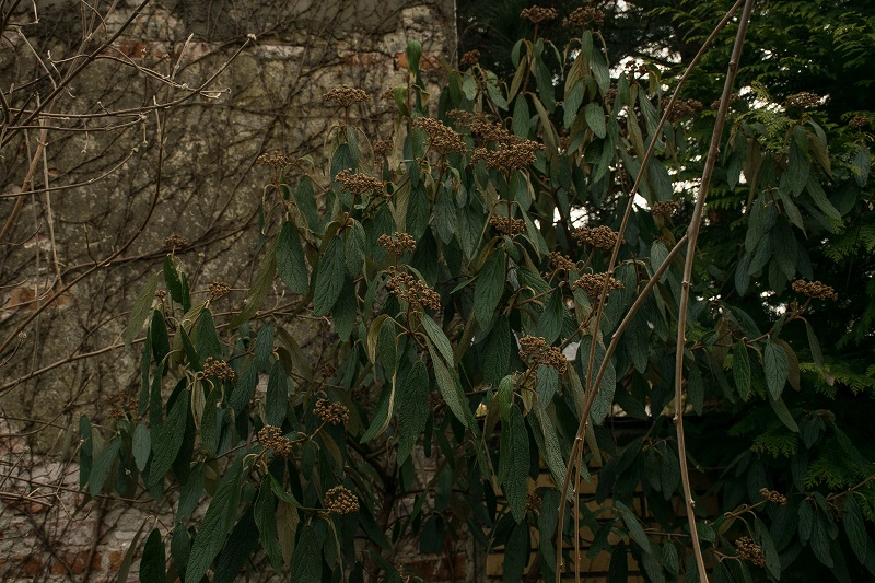 Kalina sztywnolistna (Viburnum rhytidophyllum) 07.06.2021 już powoli przekwitała w Arboretum w Wojsławicach. Osobiście przypadły mi do gustu błyszczące liście tej kaliny.
