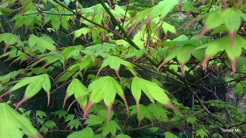 Wybrałem się w tygodniu po owocówkę, a przyjechałem z klonikiem 'Tsuma-Beni' Pewno bym go nie kupił gdyby nie te kilka młodych listków, którym pomyliła się pora roku.