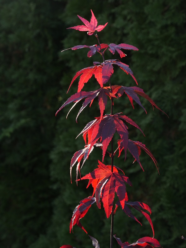 Liście: żywo czerwone, szczególnie wiosną i jesienią, ale latem, choć kolor trochę przygasa, również są czerwone, 5-7 klapowe.