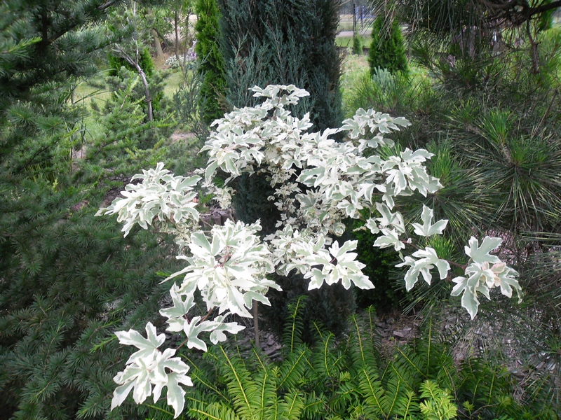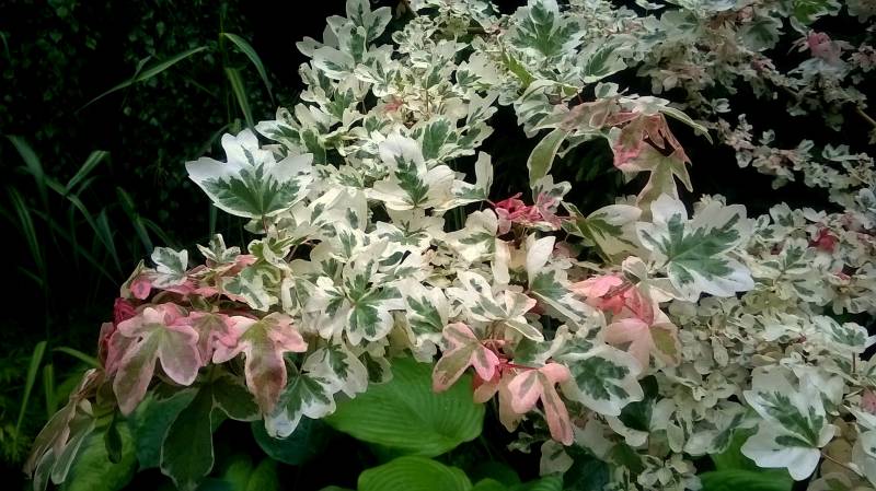Liście: 3- do 5-cioklapowe, do 10 cm szerokości, zaokrąglone, dwukolorowe: ciemnozielone centrum z szerokim, kremowobiałym obrzeżem, młode liście i pędy różowawe