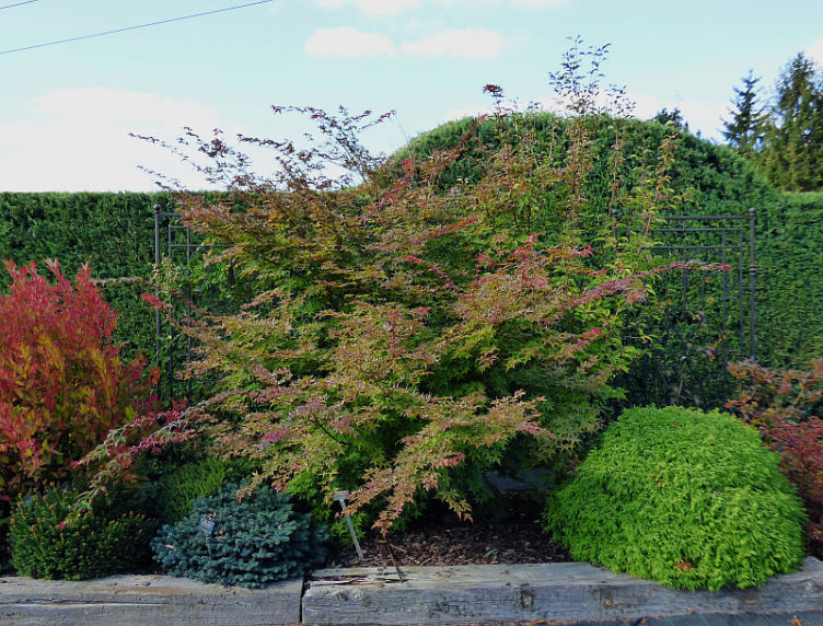 Pochodzenie: odmiana znana w Japonii przed rokiem 1900 Wymagania: stanowisko słoneczne lub półcieniste, osłonięte od wiatru, gleba równomiernie wilgotna, próchniczna, o odczynie lekko kwaśnym Wielkość: dorasta do 3-4 m Pokrój: rozłożysty Liście: 5-klapowe, głęboko wcięte aż do nasady, dość małe 5-6 cm, różowo szkarłatne wiosną, jasnozielone latem, jesienią wybarwiają się na czerwono Mrozoodporność: młode egzemplarze zaleca się okrywać na zimę
