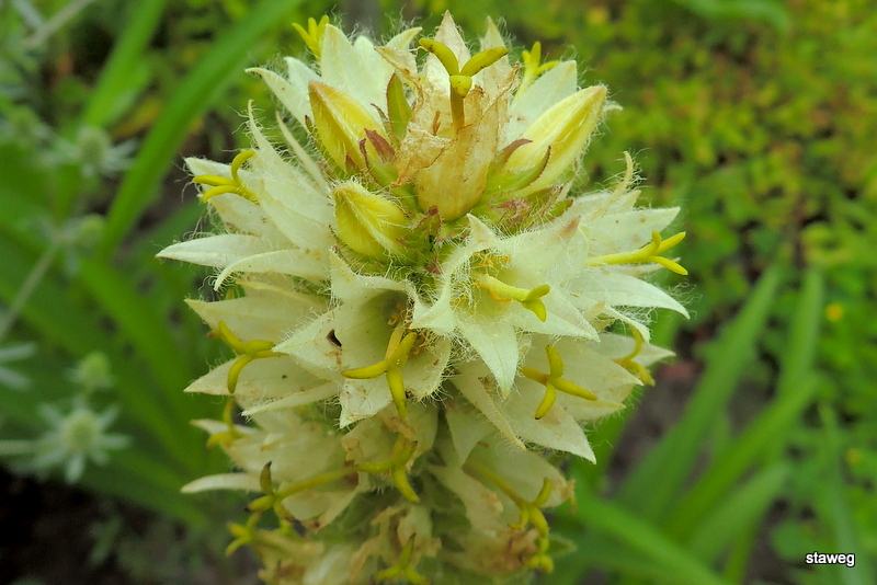 Kwitnie od połowy czerwca, czasem nawet do końca sierpnia. Kwiaty - małe owłosione dzwonki koloru zielonkawożółtego, zebrane w kłosy osiągające wysokość do 60 cm.